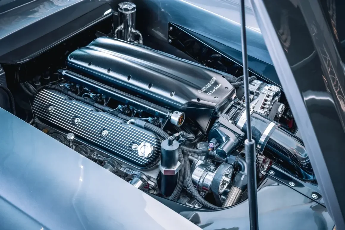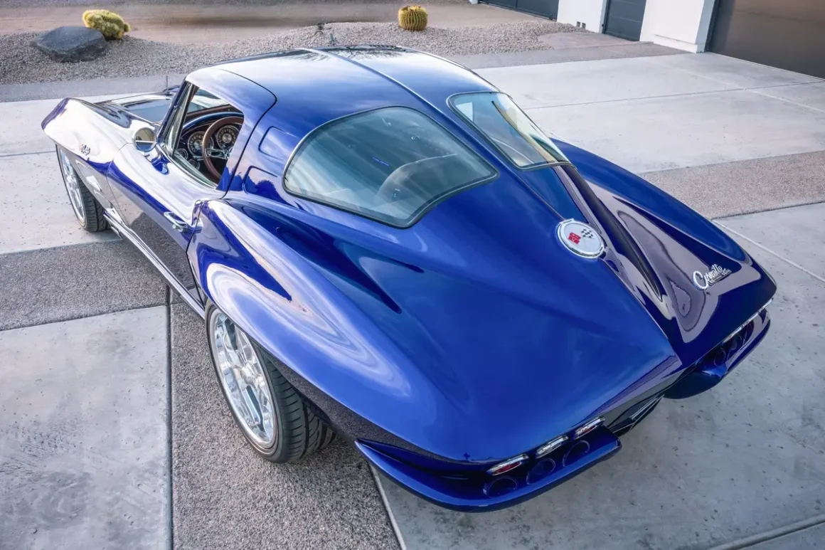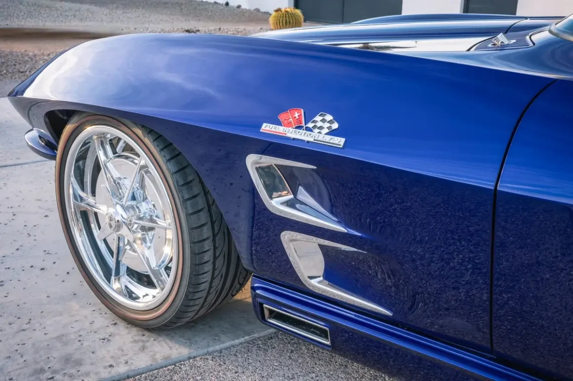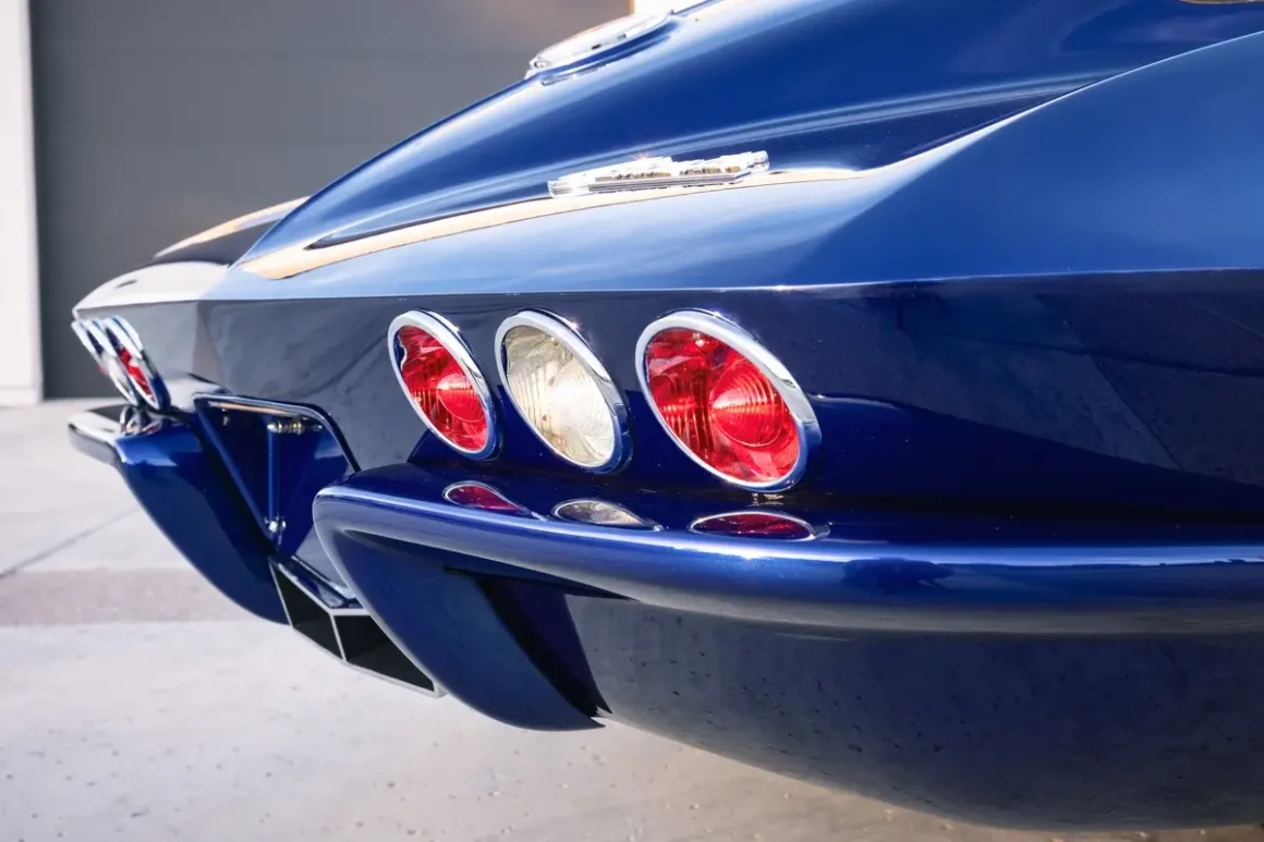 Shope’s second offering, a 1963 Corvette Split-Window Widebody known as “Night Train,” Lot 1373, represents an even bolder vision. Finished in a deep, custom PPG Candy Blue, the car seems to glow from within, its paint shimmering across surfaces that have been completely reshaped. The build began with a 60,000-original-mile 1963 Corvette Split-Window body, which was removed from its chassis and transformed through an extensive fabrication process. A fully handcrafted widebody kit reshaped the iconic lines, and the body was worked inside and out before receiving its show-quality finish, polished to a near-liquid shine.