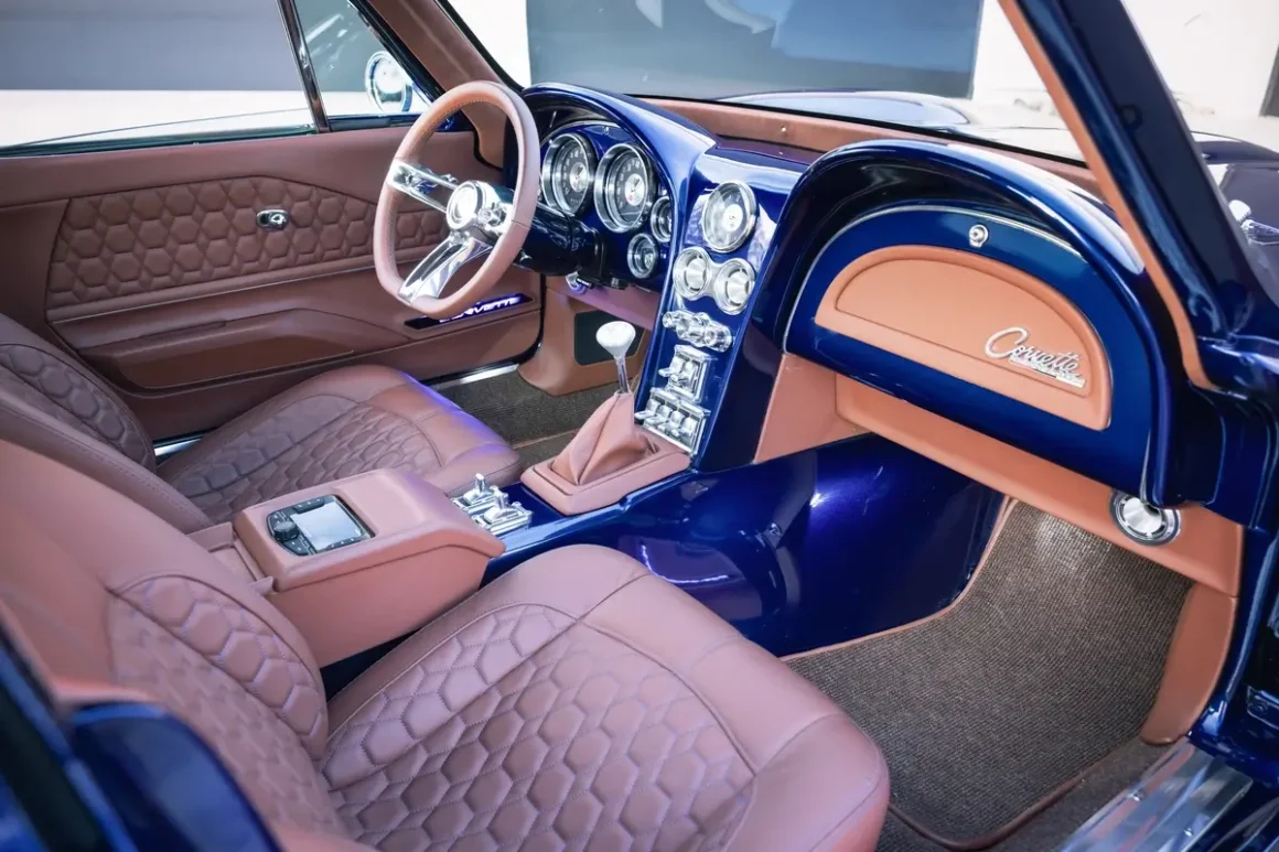 Beneath the custom hood lies serious performance: a Texas Speed–built LT4 engine producing over 700 horsepower. It exhales through a switch-controlled stainless-steel exhaust system that can route its sound through the center rear or behind the front wheels at the push of a button. Power is delivered through GM’s eight-speed automatic transmission, and the entire build rides on a Roadster Shop chassis with every component finished in Burnt Silver powder coat. Brembo power disc brakes ensure confident stopping performance, while power steering adds everyday usability. A set of one-off Curtis Speed wheels, measuring 19 inches up front and 20 inches in the rear, completes the stance. Their design was inspired by the original 1963 hubcaps but reimagined for a wider, more aggressive footprint.